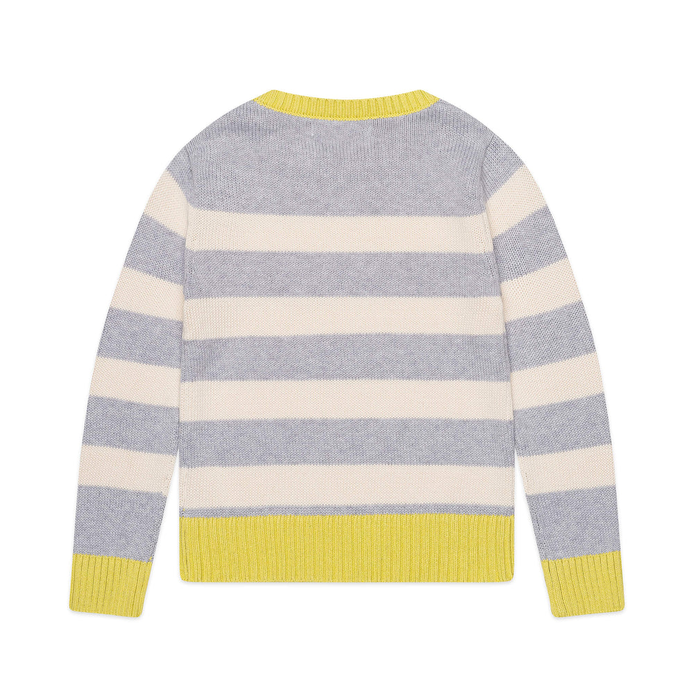 • Bold Stripe Design: Grey and ivory stripes accented with bright yellow trim at the collar, cuffs, and hem for a playful pop of color.